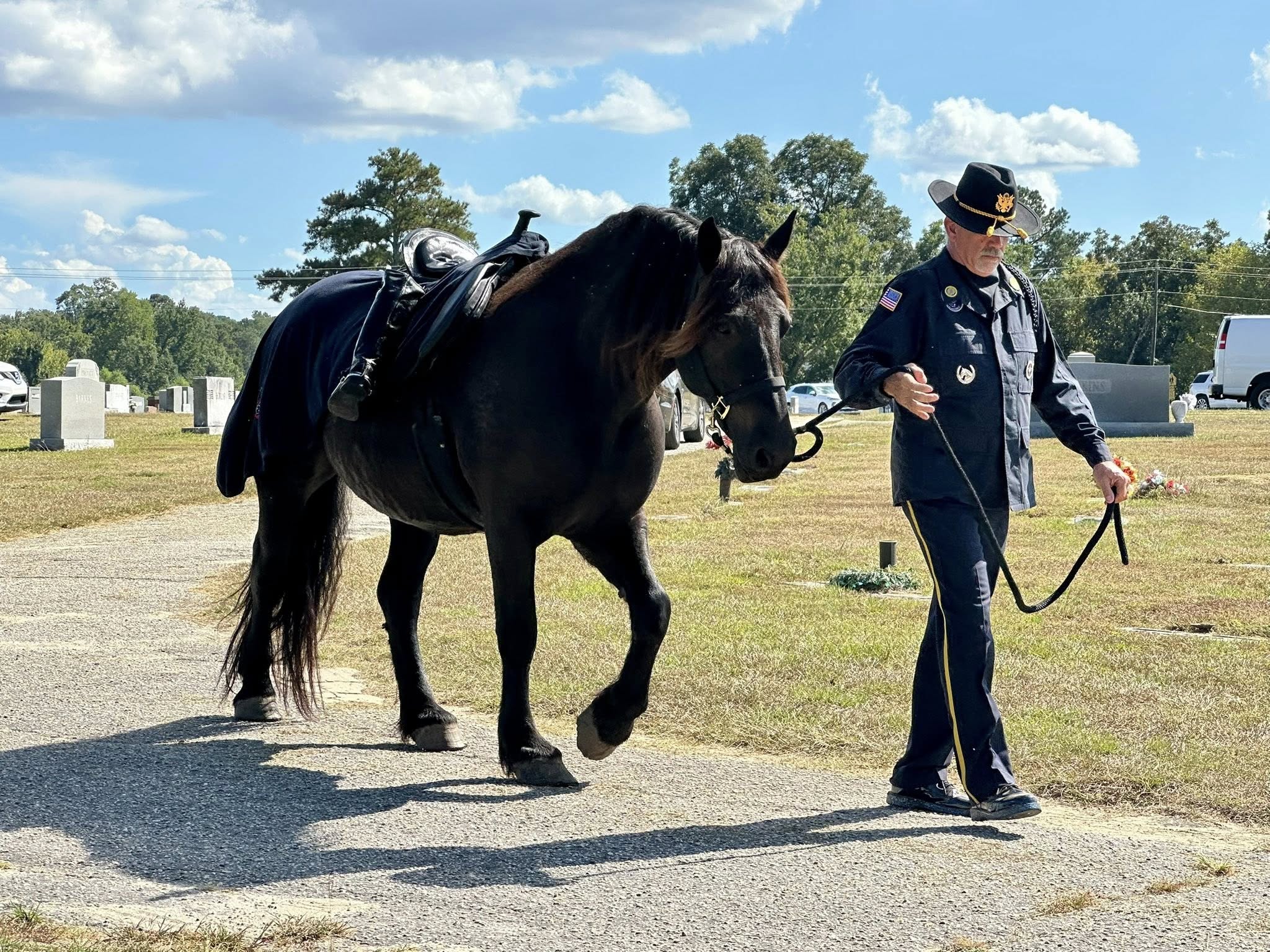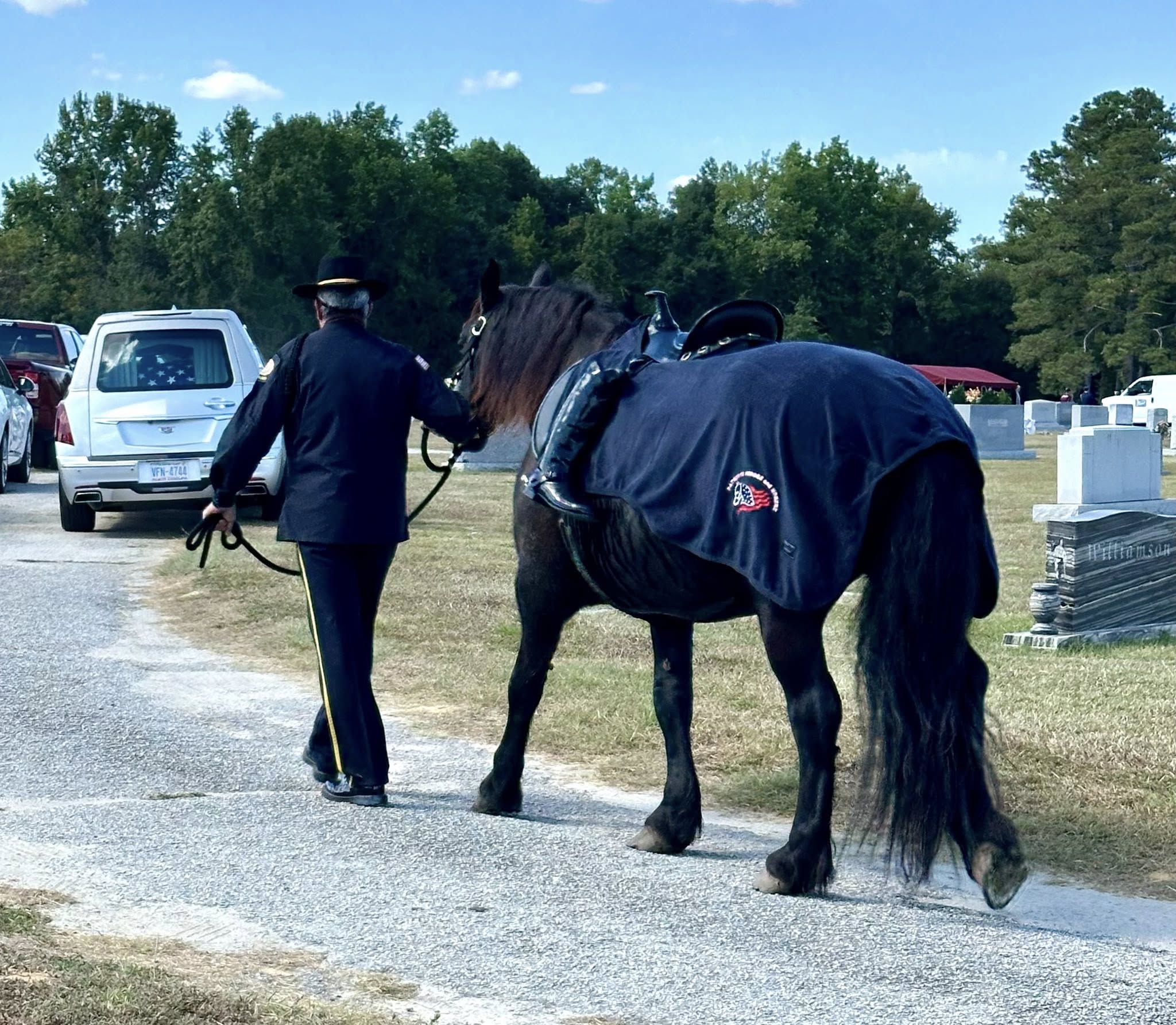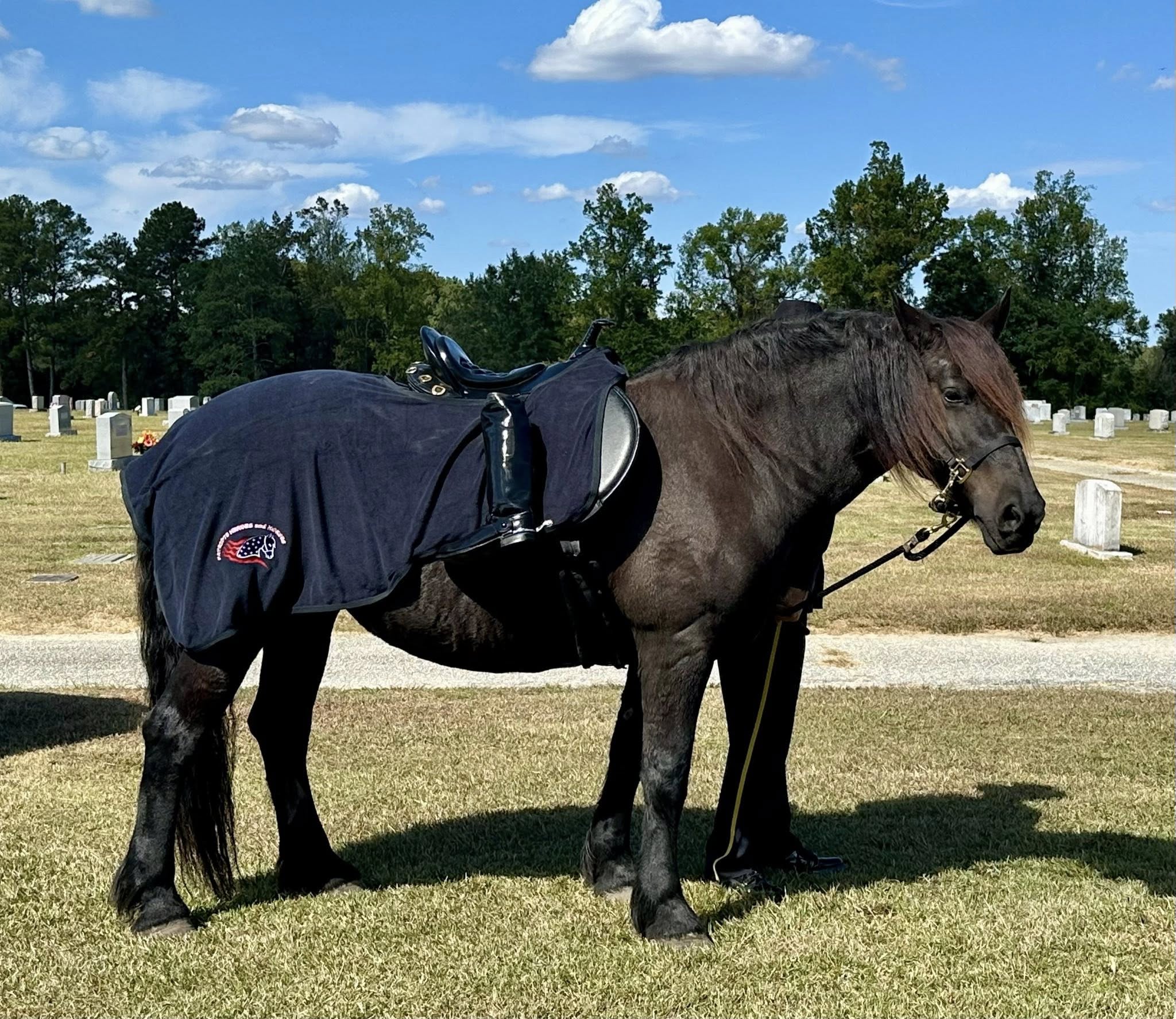 Patriots Heroes and Horses is proud to offer the Caparisoned Horse, also known as the ceremonial Military Riderless Horse for the funeral procession of the fallen military, military veterans or our Emergency Services Personnel. With the large number of prior military, we found that funeral homes were having trouble finding ways to honor the fallen. Patriots Heroes and Horses will honor the fallen with their specially trained military style horses using a similar ceremonial style as the U.S. Army Old Guard.